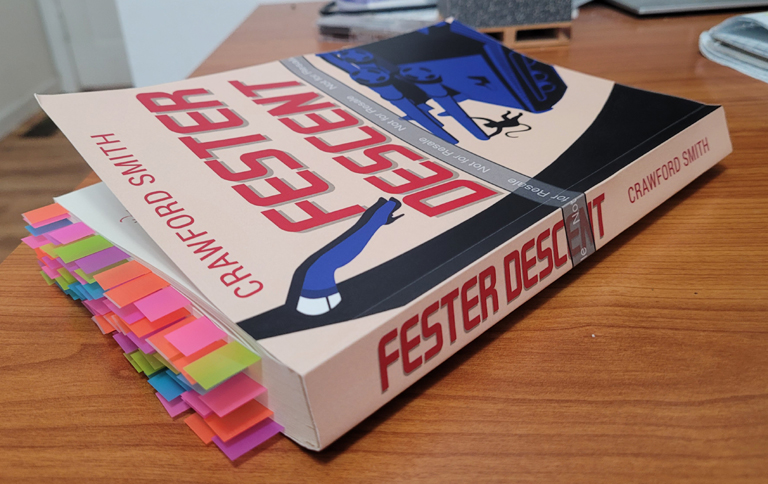 I’m in the home stretch to get Fester Descent edited and proofread ahead of the February 28 release date. It’s always a weird time during the revision of a book – trying to balance the desire to publish the best possible story with the fact that I’m sick unto death of reading it. The image above represents perhaps the fifth or sixth copy I’ve revised since the “final” draft was written.